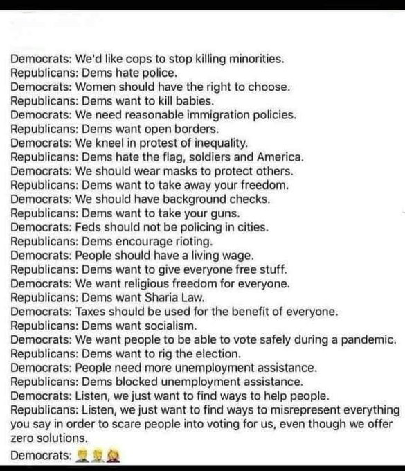 All in all the majority of the republican talking points are 100% true of the Dem party and the Dems pull the same fear mongering bullshit and if they can’t find a way to use fear mongering when they disagree they just label the other side of the argument as racist.