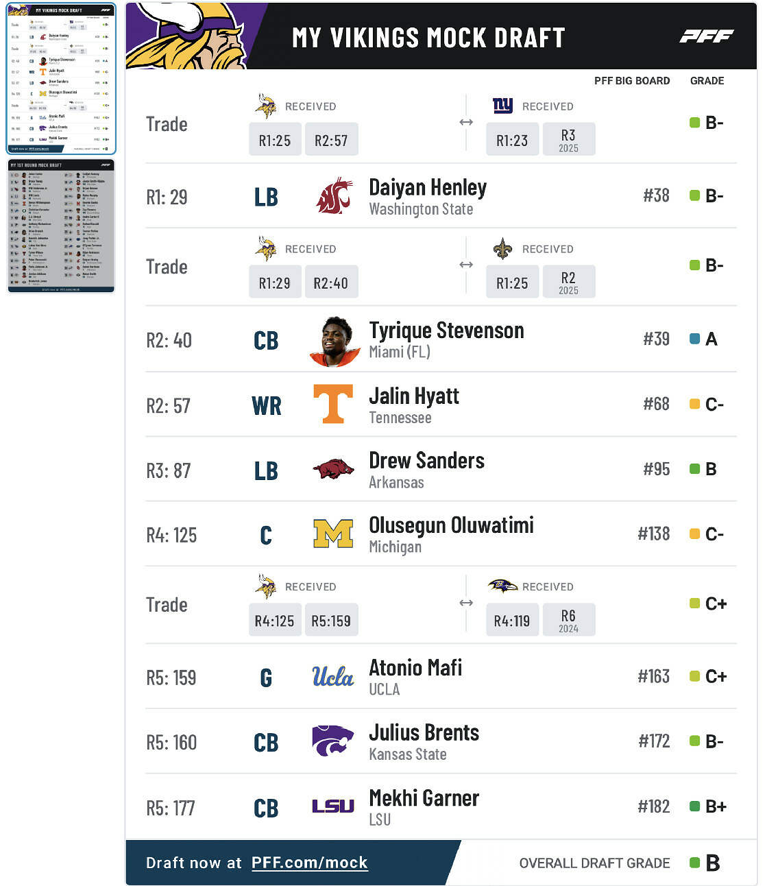 I like this draft as it would allow us to release Kendricks and pick up two dynamic rookie LB’s both who cover space well and Sanders is probably the best pass rushing LB in this class and would fit in Flores 3-4 perfectly. 3 CB’s picked would really boost our corner secondary room and maybe allow for Harry to move on and save cap if the safeties don’t have to coverup the lack of corner quality play we’ve had.