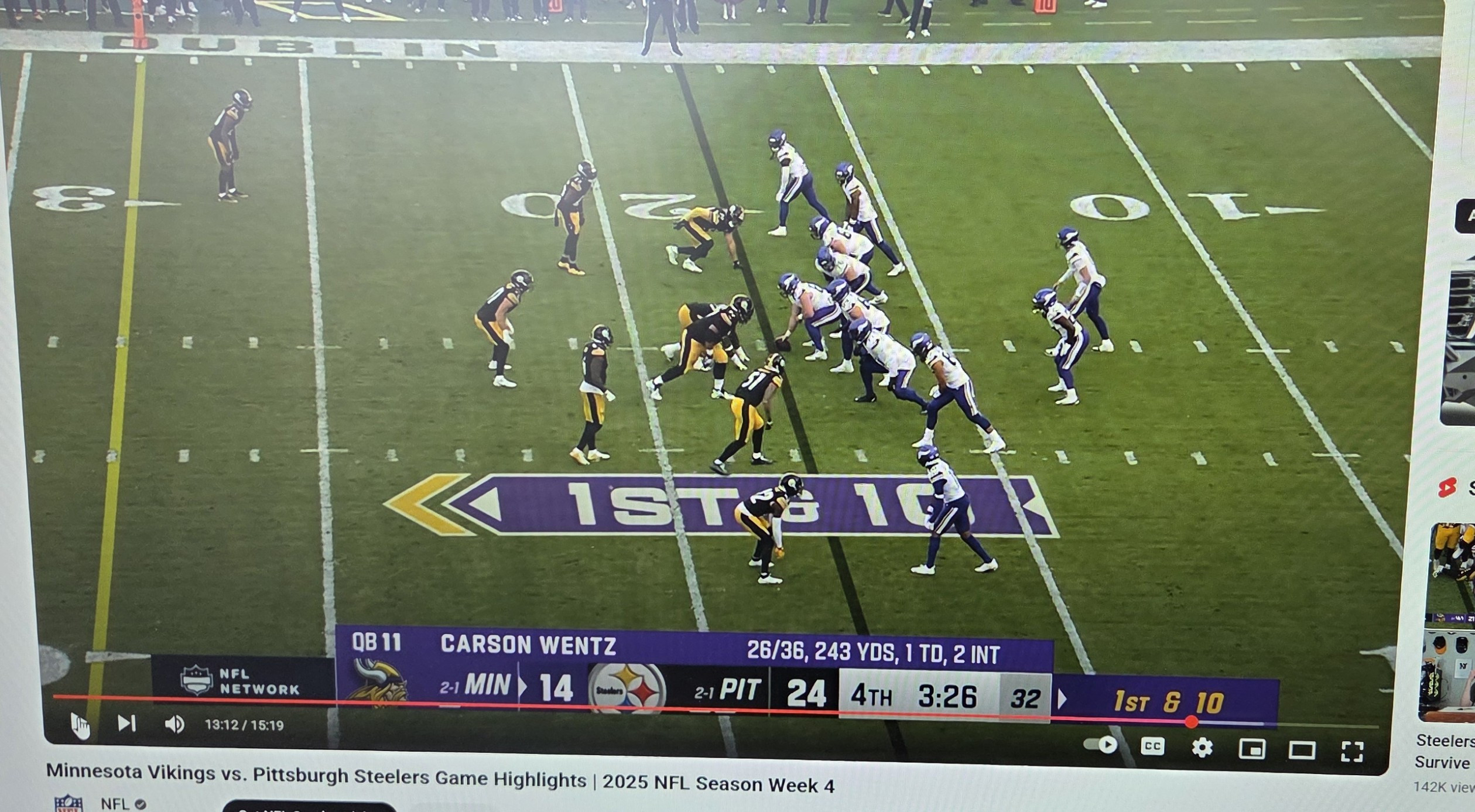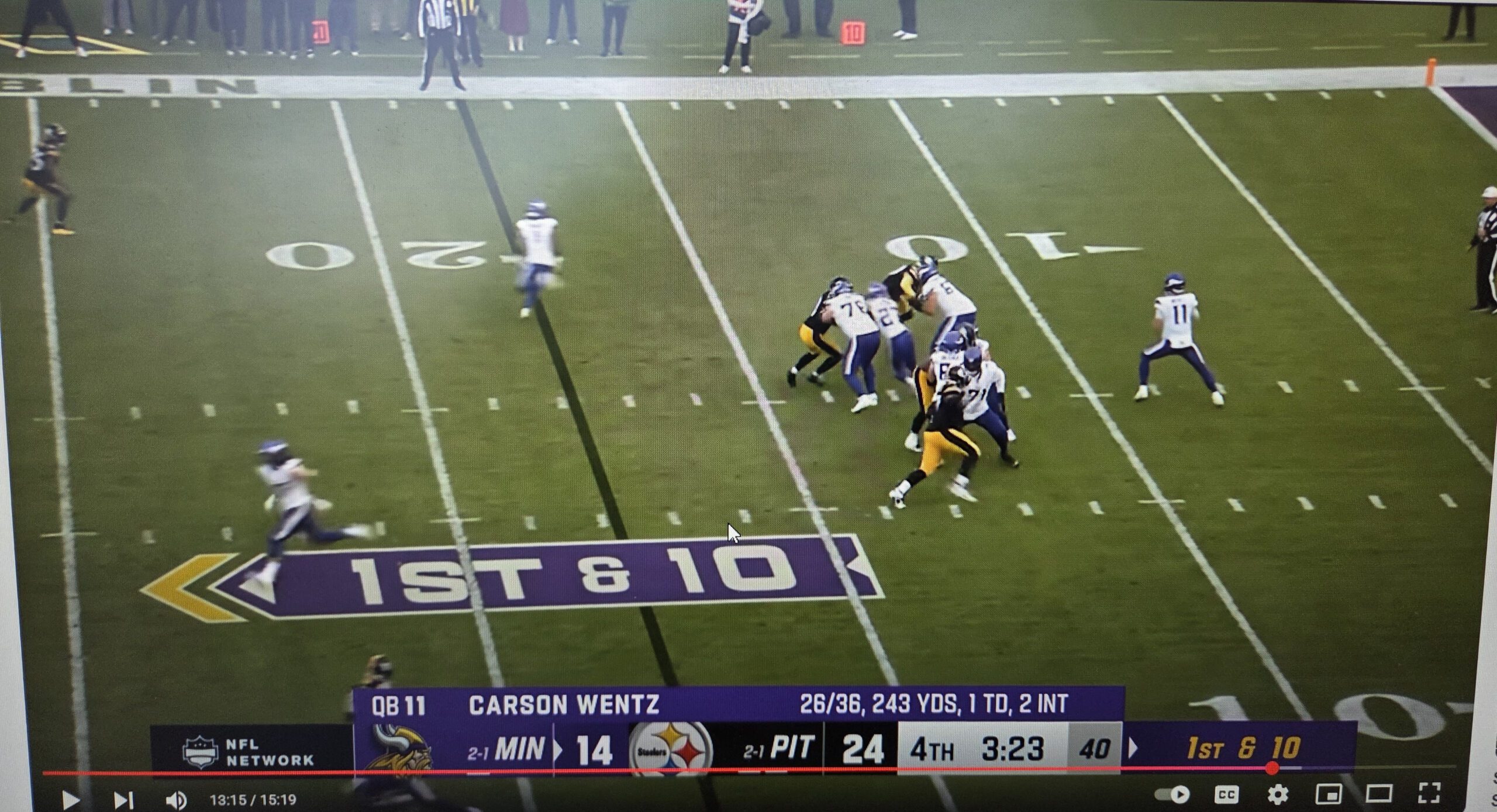 That’s OK… the point is correct. The Steelers showed pressure, then fell back into coverage, and expected Wentz to hurry his throw and hit someone underneath. They blew the coverage on Addison, and Wentz didn’t panic though.