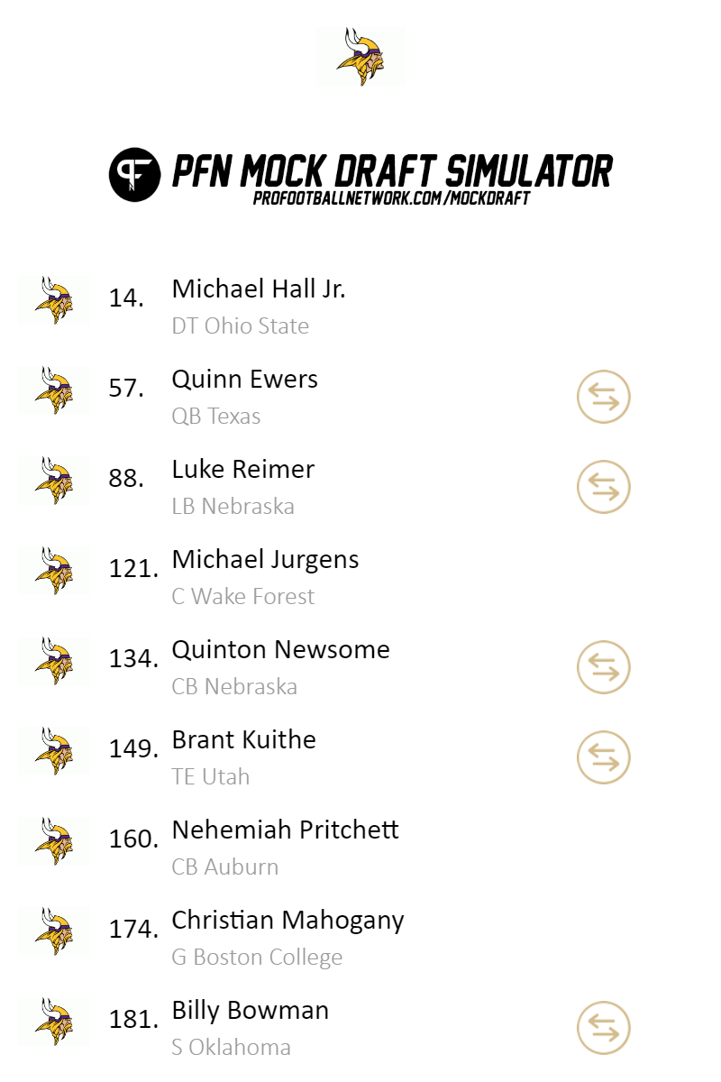 I’ve seen reactions fom one end of the spectrum to the other regarding the Vikings draft. I thought that KAM was better at navigaiting trades in his sophomore draft. Overall, I feel that he did a good job of using the limited resources he had, and using them to produce a draft that has potential to be a good one.