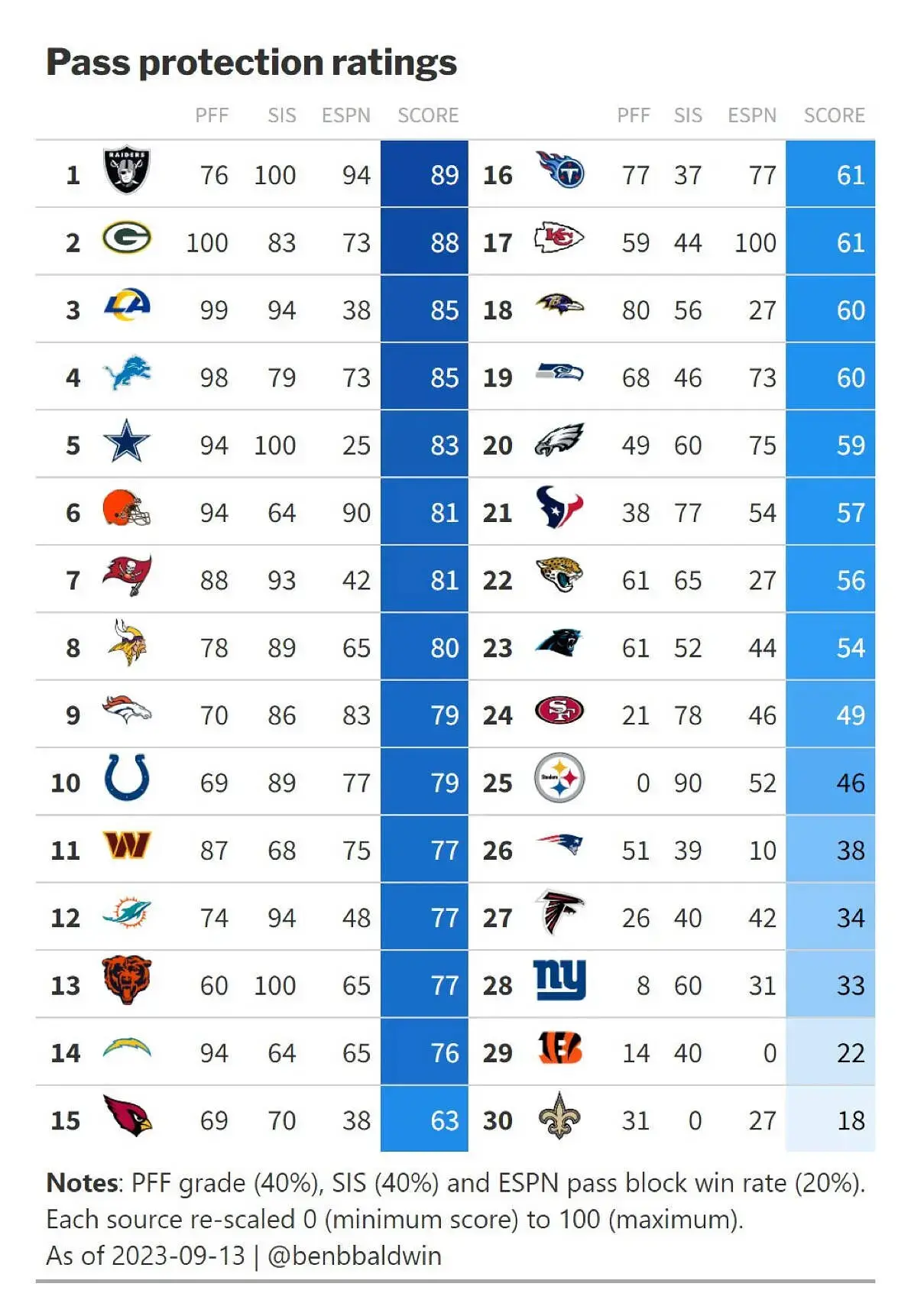 Little factoid here for all… last week the two most blitzed QB’s in the league were Kirk Cousins… and Baker Mayfield. Cousins was blitzed 21 times and Mayfield was blitzed 19. Mayfield was sacked once and hit twice. Cousins was sacked twice and hit 9 times.