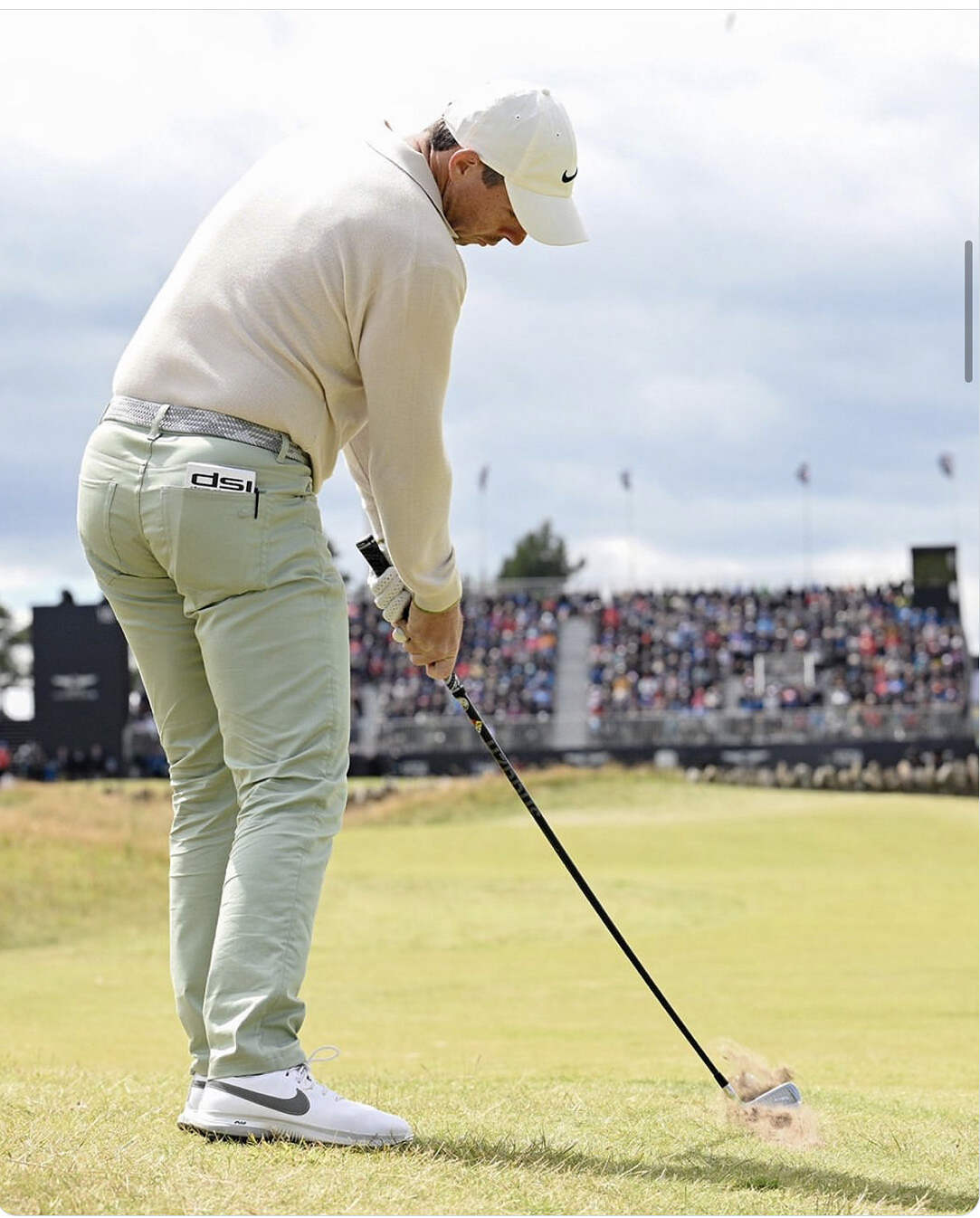 Look at him, looks like an easy practice swing, no tension, clearing the left side, absolutely nothing forced but the reality is it’s his hardest iron swing with a driving iron in to a blistering wind. Knocked it 10’ from the hole. Amazing.