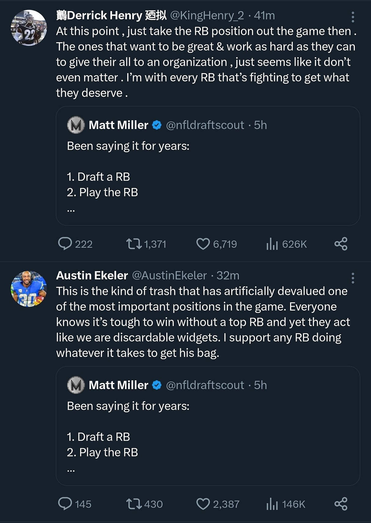 Yeah, RB position has become draft, apply 5th year option (if a 1st round pick), franchise tag, then let them walk. The franchise tag for RBs is actually cheaper now than it was in 2015, crazy.