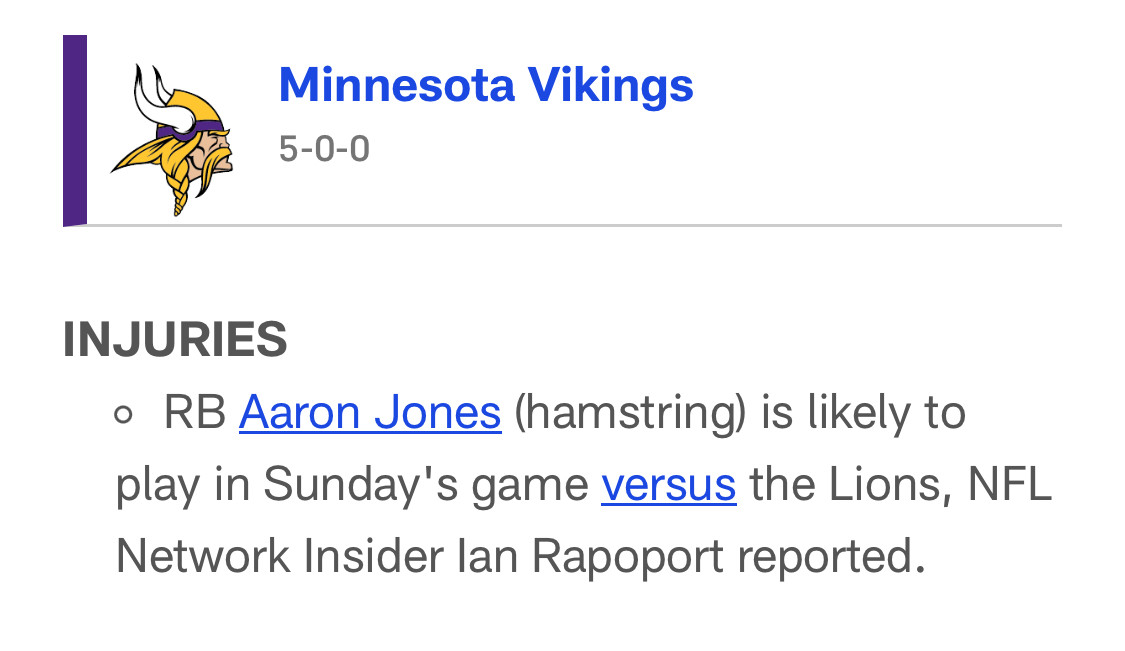 A billion thanks to Surly and Bowbunch for covering the past couple of days, it’s much appreciated. So, T.J. Hockenson is officially NOT going to start against the Lions on Sunday, but he did say that he’s eyeing a week 8 return. It’ll be nice to get Hockenson back into the lineup, make it even harder for opposing defenses to cover everyone, and give Darnold a reliable safety valve for when protection is lacking (sideways glance/glare at Ingram and Bradbury).