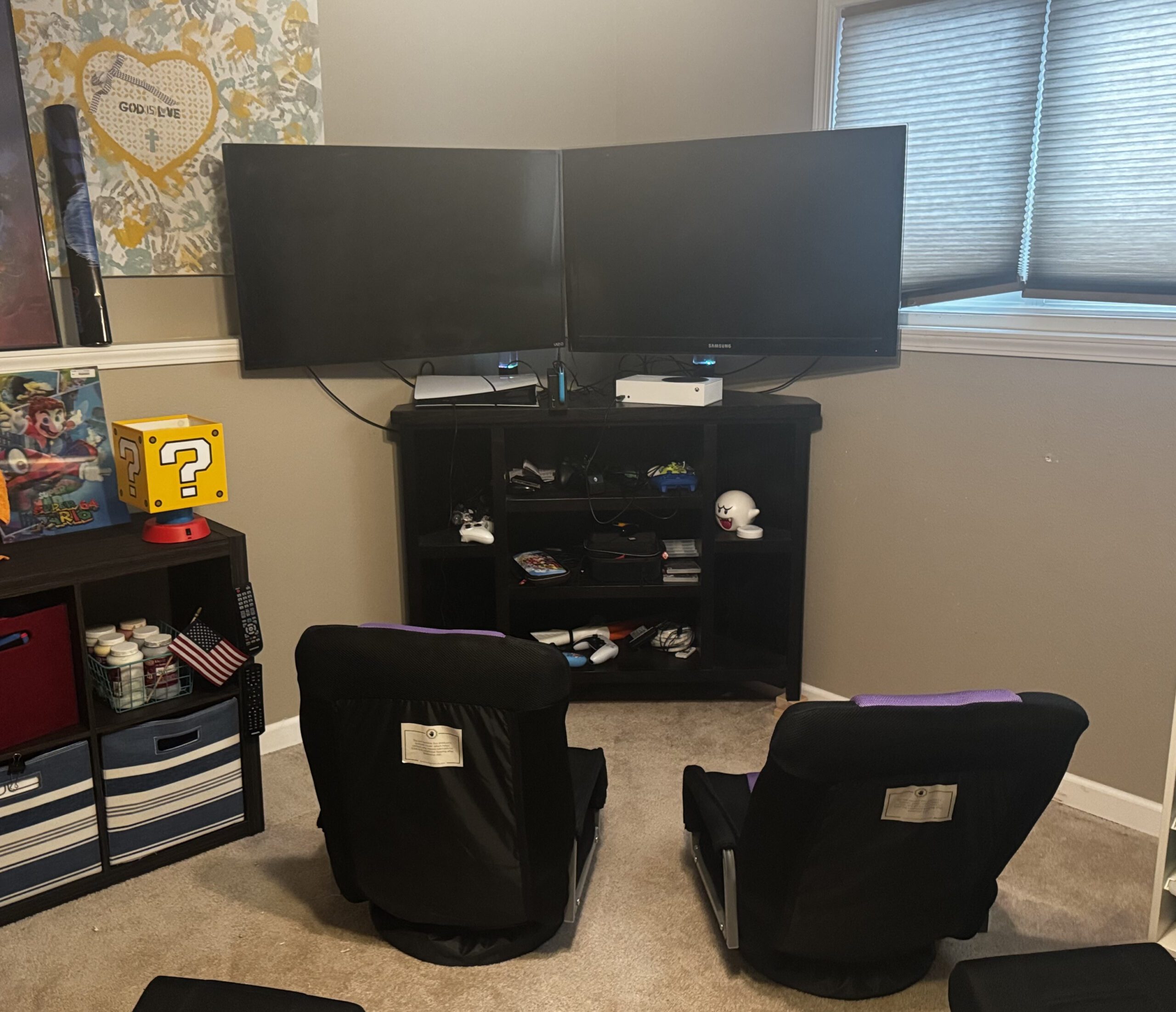 We play Fortnite together as a team, he can play with the Nintendo Switch on one screen & I play on the X Box on the other screen. We recently added a PS5 that we purchased using tickets we won at the arcade.