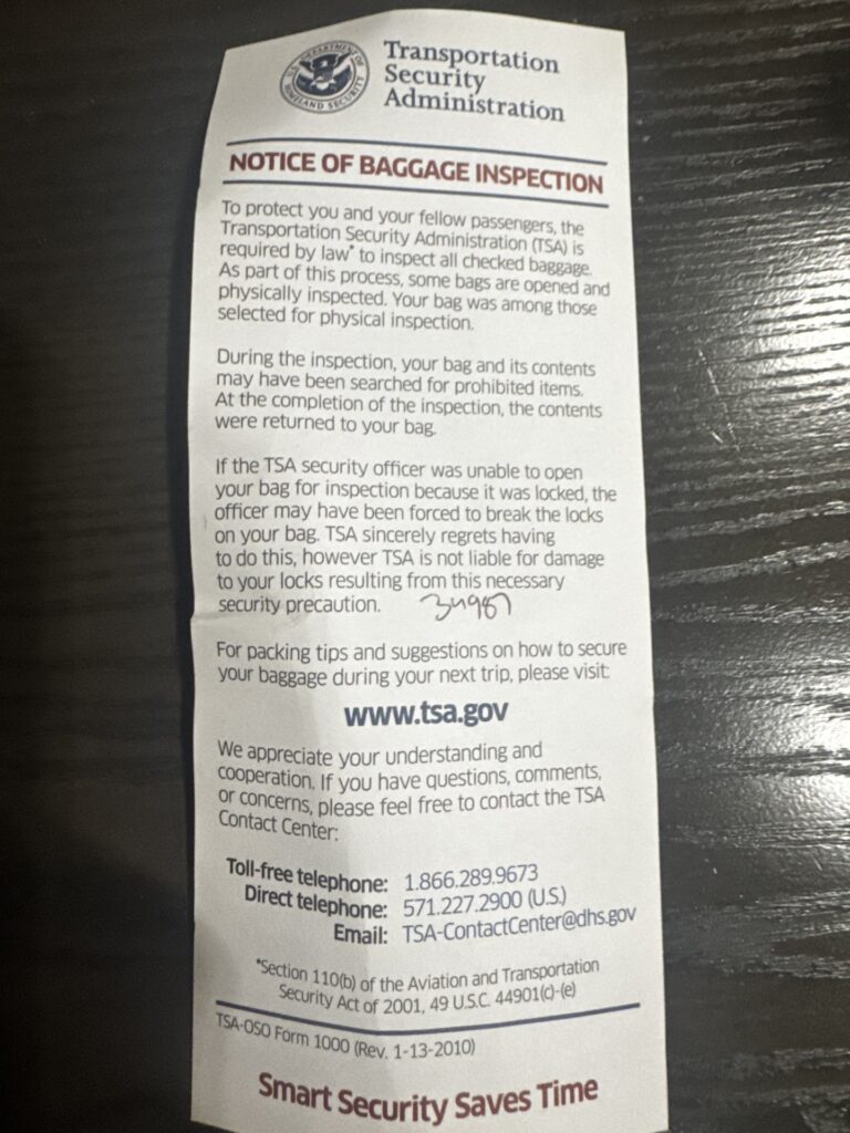 There’s something I DO NOT like, and that’s the gestapo that they call the TSA. I hate that we’ve become such a nation of pansies that we’re willing to allow these nazi bastards to violate our privacy, grope us at the airport, and search through our personal belongings. I opened my luggage and found this, I get these far too often when I fly, and it p***es me off.