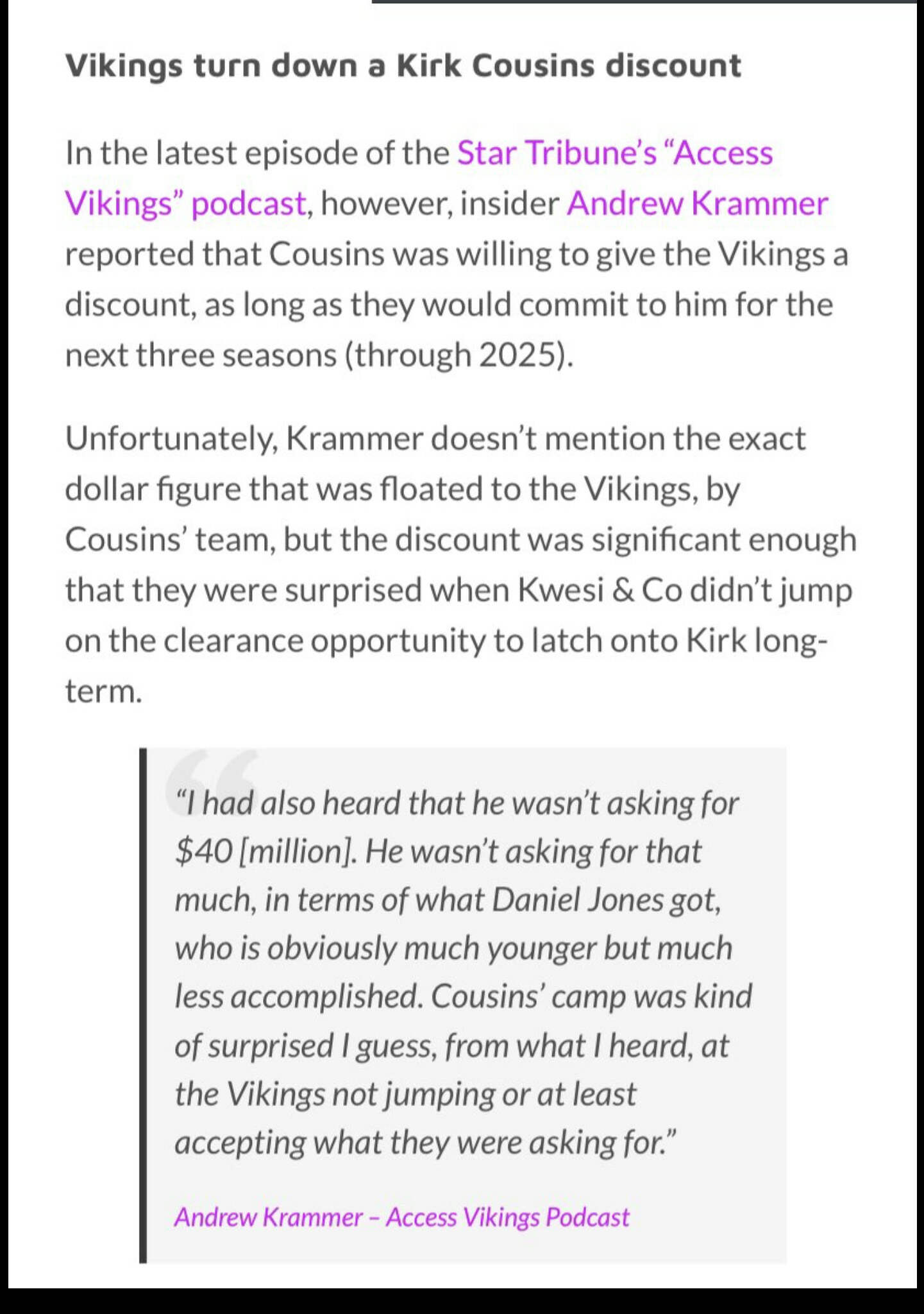 Cousins was willing to give them a price break so all you nannies saying he wanted top QB money were WRONG!