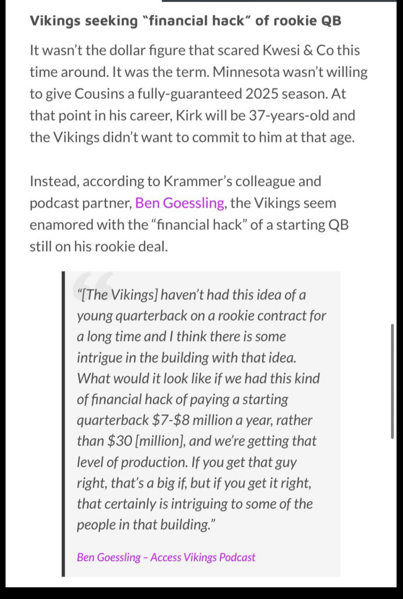 On the other hand, why would the Vikings have Cousins sit on the bench? To force him to ask for a trade? That’s messy and it’s called cutting off your nose to spite your face. They just gonna roll with Mullens?