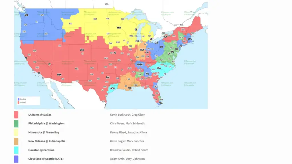 People in the yellow areas shown on the map from 506sports.com will be able to watch the game on their iOS mobile devices with the Vikings app or Vikings mobile site (Safari browser only). The Yahoo! Sports app for smartphones and tablets offers another method for viewing live local and prime-time NFL games.