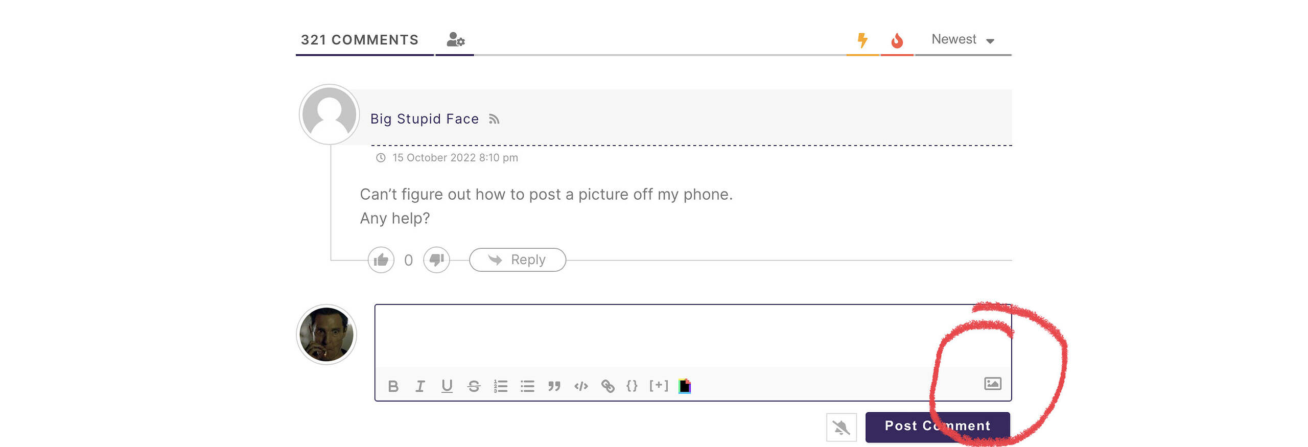 there is an icon circled below, click on that select photo library and post your pic. Have to have at least 1 character typed in the comment.