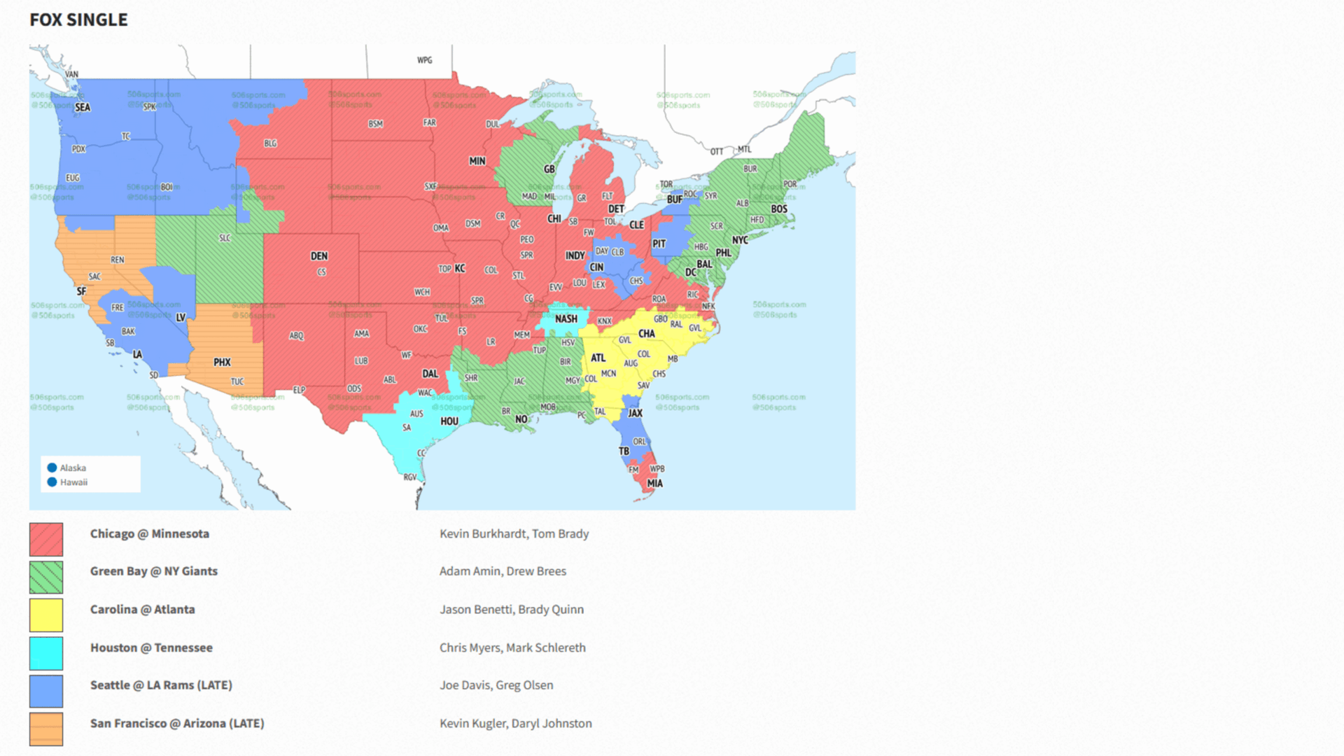FOX (KMSP FOX 9 in the Twin Cities) will televise the game. Areas in red on the map above are scheduled to show the game.