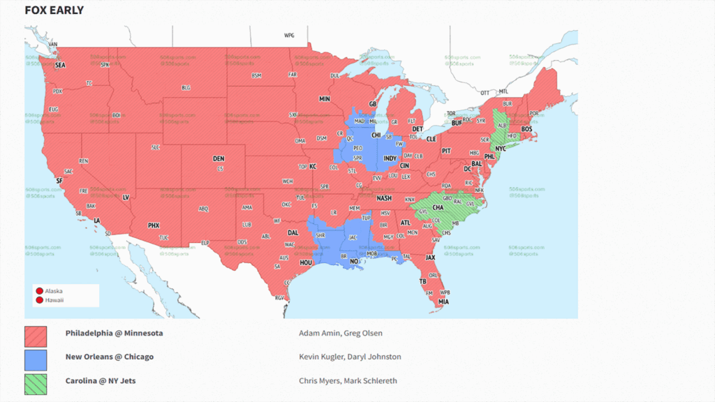 FOX (KMSP FOX 9 in the Twin Cities) will televise the game for most of the country (except the New Orleans, Chicago, Carolina and New York Jets marketing areas).